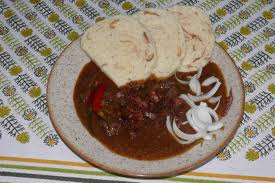 POSTUP:Maso nakrájíme na drobné kousky,do pánve dáme orestovat na drobno posekanou cibuli a zaprášíme paprikou smažíme do zlatova(téměř připálit),přisipeme maso a necháme ho pustit štávu,kterou vyvyříme.Smícháme pivo s vývarem kterým podléváme maso.vaříme dokut není maso měkké(pro urychlení=papinák).Ochutíme pepřem,ke konci přidáme na jemno nastrouhanou chlebovou kůrku.Necháme provařit.podaváme s chlebem,knedlíkem nebo s pečivem.A pivem!
