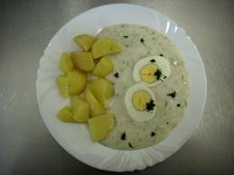 POSTUP:Asi 2/3 smetany rozkvrdláme mouku a zavaříme do slané vody,podle chuti okyselíme a osladíme.Do trochu povařené omáčky zavaříme kopr a přilejeme žlouty rozmíchané ve zbytku smetany.Když přichází k varu odstavíme.Místo vody můžeme dát sladké mléko.podáváme s bramborem a vařenými vejci.